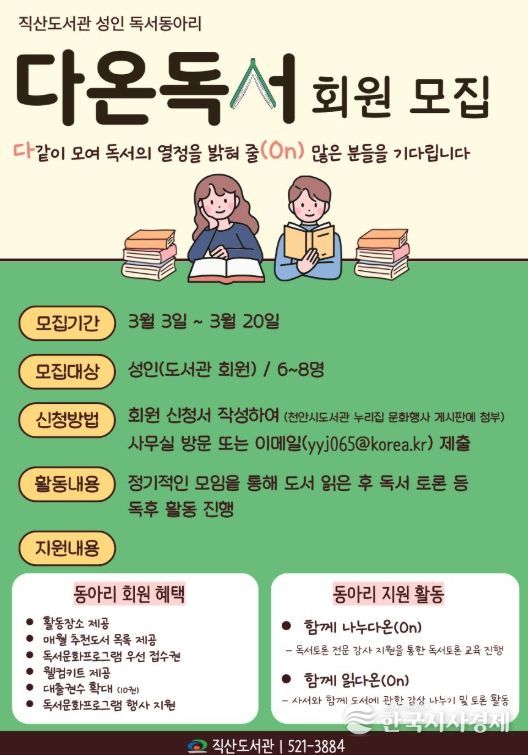 한국시사경제 충남취재본부 | 천안시 직산도서관은 내달 3~ 20일 성인 독서동아리 ‘다온독서’ 참여자를 모집한다고 26일 밝혔다.