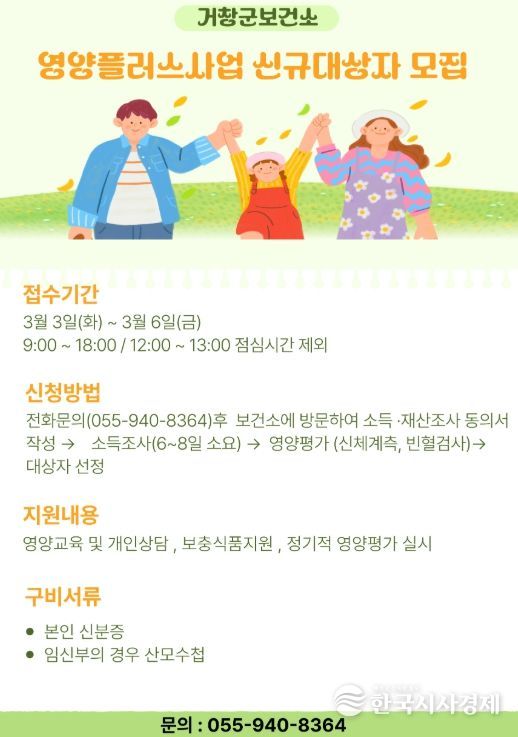 한국시사경제 경남취재본부 | 거창군은 임산부와 영유아의 영양 문제를 개선하기 위해 영양플러스사업 신규 대상자를 오는 3월 3일부터 6일까지 모집한다.