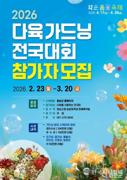 한국시사경제 권충현 기자 | 화순군은 2월 23일부터 3월 20일까지 ‘2026 다육 가드닝 전국대회’ 참가자를 모집한다고 밝혔다.