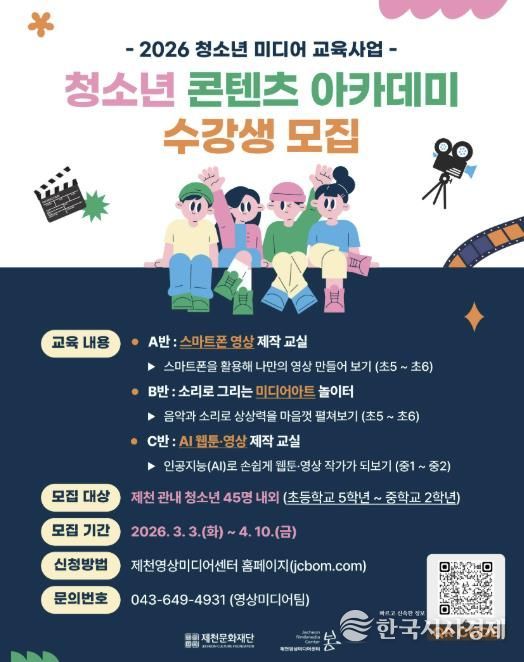 한국시사경제 충북취재본부 | 제천문화재단은 2026년 청소년 영상제작 교육사업'청소년 콘텐츠 아카데미'를 운영하고 수강생을 모집한다.