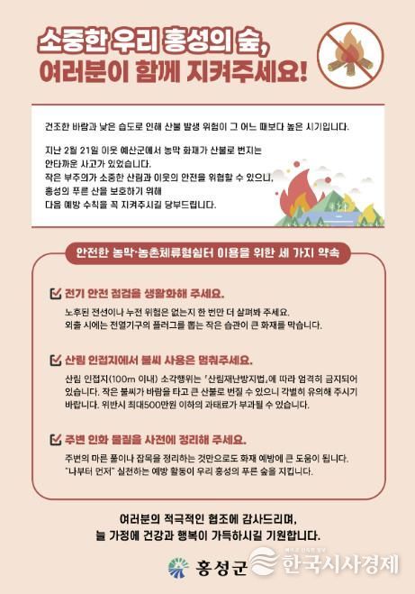 홍성군은 이번 조치를 계기로 산림 인접 시설 중심의 자율 안전관리 체계를 강화하고, 지속적인 홍보와 점검을 병행해 화재 위험 요인을 사전에 관리해 나갈 계획이다.