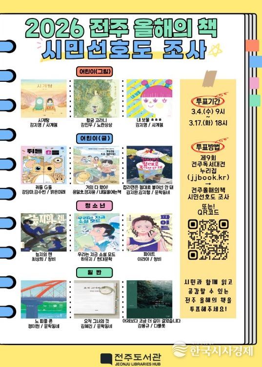 시는 오는 17일까지 약 2주간 2026년 한 해 동안 시민과 함께 읽고 공감할 ‘2026 전주 올해의 책’ 최종 선정을 위한 온라인 시민 투표를 진행한다고 4일 밝혔다.