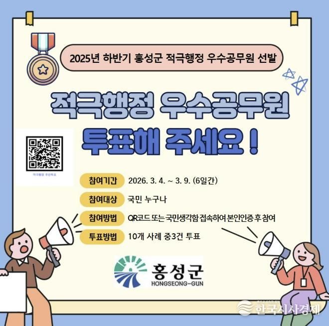 한국시사경제 김태훈 기자 | 홍성군이 ‘2025년 하반기 적극행정 우수공무원 선발’을 위해 오는 9일까지 국민권익위원회 ‘국민생각함’ 플랫폼에서 온라인 주민 투표를 진행한다. 부서·직원·국민 추천을 통해 선정된 적극행정 우수사례를 대상으로 지역과 관계없이 누구나 참여할 수 있다.