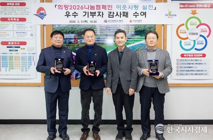 한국시사경제 김숙영 기자 | 부산 북구는 희망2026나눔캠페인 기간 이웃사랑 실천에 앞장선 우수 기부자에게 부산사회복지공동모금회(회장 이수태) 감사패를 수여했다고 밝혔다.