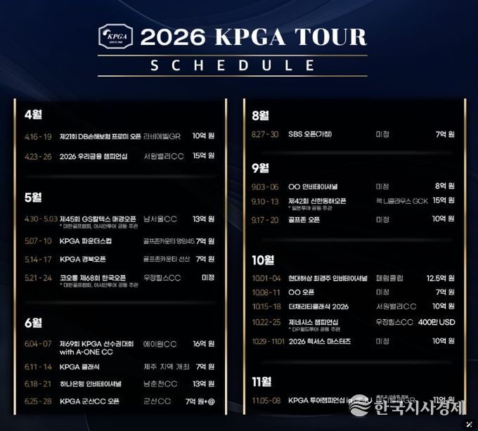 한국시사경제 스포츠팀 | ㈜한국프로골프투어(대표이사 김원섭, 이하 KPGT)가 3월 5일, 2026 시즌 KPGA 투어 일정을 발표했다.