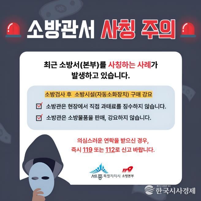 한국시사경제 세종취재분부 | 최근 세종소방본부를 사칭해 소방용품 구매를 강요하는 사기 시도가 잇따르고 있어 시민들의 각별한 주의가 요구된다.