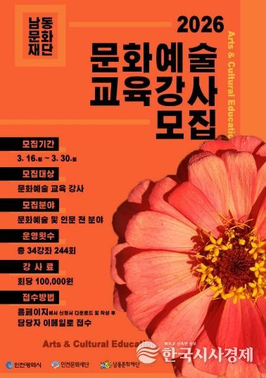 한국시사경제 윤광희 기자 | 인천문화재단과 남동문화재단이 ‘2026년 문화예술 교육 사업’ 추진을 위한 문화예술 교육 강사를 공개 모집한다.