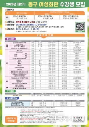 한국시사경제 윤광희 기자 | 인천 동구는 오는 3월 9일~4월 3일까지‘2026년 제2기 동구 여성회관’ 수강생을 모집한다고 밝혔다.