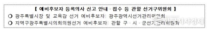 한국시사경제 기동취재팀 | 중앙선관위는 3월 5일 '전남광주통합특별시 설치를 위한 특별법'이 공포됨에 따라, 전남, 광주의 시·도지사(교육감 포함) 및 지역구시·도의회의원 선거의 예비후보자가 그 신분을 유지하려면 3월 16일까지 예비후보자 등록의사를 관할 선거구위원회에 서면으로 신고해야 한다고 밝혔다.