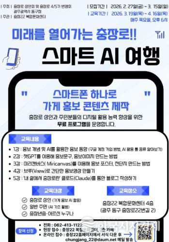 모집 기간은 15일까지이며, 충장로 상인(가게 홍보용 AI 활용을 원하는 상인), 일반 주민(AI 기초 활용 희망자), 중장년 및 어르신 등 관심 있는 누구나 신청할 수 있다.