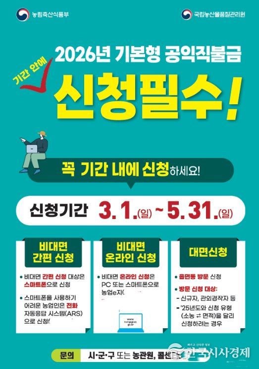 한국시사경제 김태훈 기자 | 충남 계룡시는 3월부터 오는 5월 31일까지 2026년 기본형 공익직불제(이하 공익직불제) 신청을 접수한다고 밝혔다.