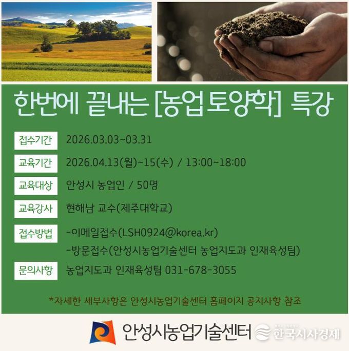 한국시사경제 경기취재본부 | 안성시농업기술센터가 오는 31일까지 토양 분야 권위자인 제주대학교 현해남 교수를 초청해 ‘농업 토양학 특강’ 교육생을 모집한다.