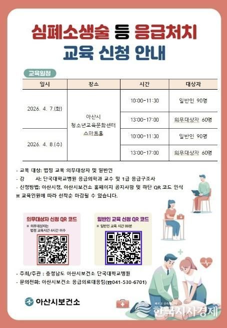 교육 신청은 아산시청과 아산시보건소 홈페이지 공지사항의 ‘2026년 심폐소생술 등 응급처치 교육 안내’에서 확인할 수 있다.