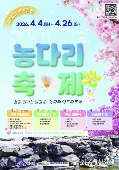 한국시사경제 김태훈 기자 | 충북 진천군의 대표 봄 축제인 ‘제26회 생거진천 농다리축제’가 오는 4월 4일부터 4월 26일까지 문백면 농다리 일원에서 열린다.