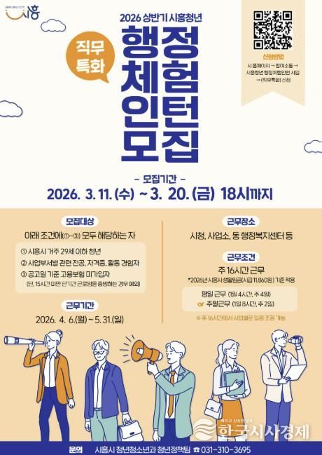 한국시사경제 경기취재본부 | 시흥시는 지역 청년들의 실질적인 일 경험과 진로 탐색을 지원하기 위해 ‘2026년 (직무특화) 상반기 행정체험 인턴 사업’을 운영하고, 3월 11일부터 20일까지 참여 청년 10명을 모집한다.