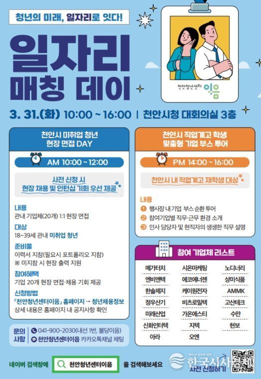 한국시사경제 충남취재본부 | 천안시가 ‘2026년 청년 일자리 매칭데이’ 참여자를 모집한다고 11일 밝혔다.