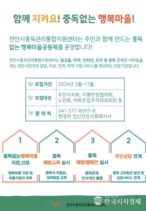 한국시사경제 충남취재본부 | 천안시중독관리통합지원센터는 올해 ‘함께 지켜요! 중독없는 행복마을’ 사업을 확대 추진한다고 11일 밝혔다.