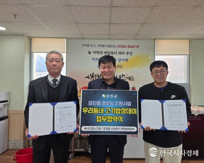 한국시사경제 문화팀 | 강진읍 노인회가 지난 4일, 2026년 ‘우리동네 고기밥상데이’ 사업의 원활한 추진을 위해 강진읍 소상공인 육류협력업체와 업무협약을 체결했다.