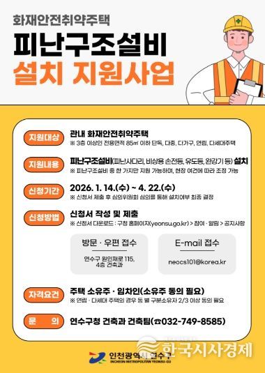 이에 연수구는 2023년부터 3층 이상이면서 전용면적 85㎡ 미만인 소규모 주택에 피난사다리, 유도등, 휴대용 비상조명, 완강기 등 피난구조설비 설치를 지원하는 사업을 시행하고 있다.