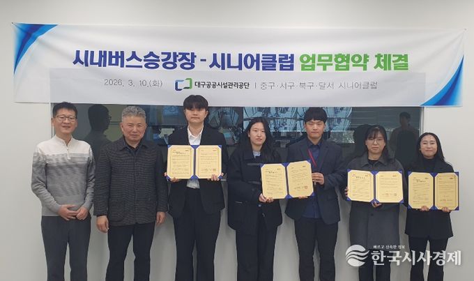 한국시사경제 대구취재본부 | 대구공공시설관리공단(이사장 문기봉) 시내버스유개승강장은 지난 3월 10일(화), 시내버스유개승강장 사무실에서 지역 4개 시니어클럽과 업무협약을 체결했다.