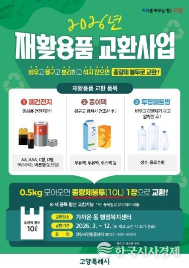 한국시사경제 권충현 기자 | 고양특례시 덕양구 창릉동은 주민들의 자원 재활용 참여를 확대하고 올바른 분리배출 문화를 정착시키기 위해 ‘2026년 재활용품 교환사업’을 운영한다고 밝혔다.