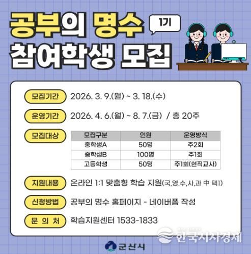 한국시사경제 전북취재본부 | 군산시는 교육격차 해소와 학생 맞춤형 학습 지원을 위해 ‘공부의 명수’ 온라인 튜터링 1기 참여 학생을 모집한다고 밝혔다.