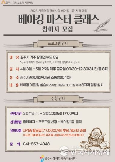 한국시사경제 김태훈 기자 | 공주시장애인가족지원센터(센터장 이영식)는 오는 3월 20일까지 장애인 부모를 대상으로 베이킹 1급 자격 과정인 ‘베이킹 마스터 클래스’ 참여자를 모집한다고 밝혔다.