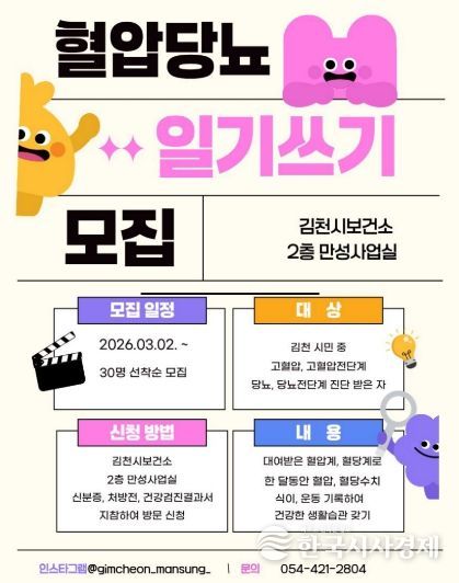 일기 쓰기 참여를 원하는 시민은 김천시보건소 2층 만성사업실에 처방전 또는 건강검진결과서를 지참하여 직접 방문 신청하면 되며, 자세한 사항은 ☎054-421-2804로 문의하면 된다.