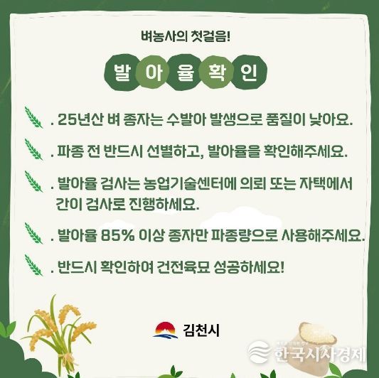 김천시는 앞으로도 안정적인 벼 육묘와 생산을 위해 종자 관리 요령과 발아율 검사 방법에 대한 기술 지원을 지속적으로 추진할 계획이다.