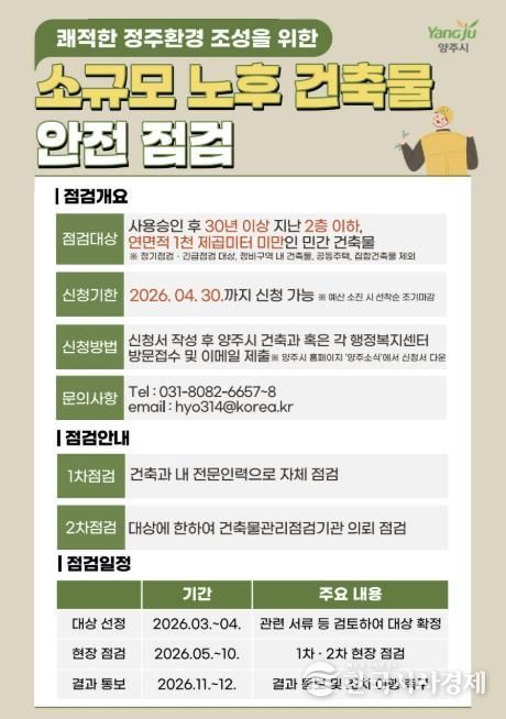 한국시사경제 경기북부취재본부 | 양주시가 준공 후 30년 이상 경과된 소규모 노후건축물을 대상으로 안전점검 지원사업을 추진한다.