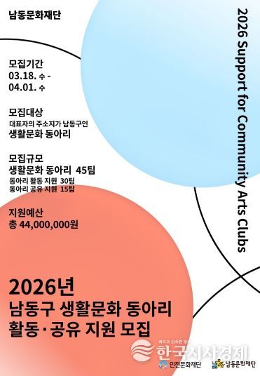 한국시사경제 윤광희 기자 | 인천문화재단과 남동문화재단은 ‘2026년 남동구 생활문화 동아리 지원사업’에 참여할 동아리를 공개 모집한다고 12일 밝혔다.