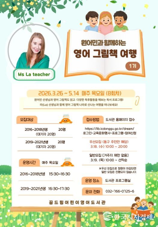 한국시사경제 윤광희 기자 | 인천 동구는 꿈드림어린이영어도서관에서 오는 18일부터 ‘원어민과 함께하는 영어 그림책 여행(1기)’ 수강생을 선착순으로 40명 모집한다고 밝혔다.