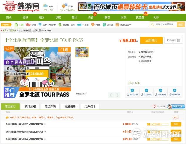 한국시사경제 문화팀 | 전북특별자치도는 도내 대표 관광상품인 ‘전북투어패스’를 중국 최대 한국 여행 정보 플랫폼인 ‘한유망(韩游网)’에 입점시키고 이달부터 본격적인 판매에 돌입했다고 12일 밝혔다.