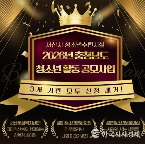 한국시사경제 충남취재본부 | 서산시 청소년수련시설(서산문화복지센터, 해미‧성연청소년문화의집) 3개 기관이 충남사회서비스원 청소년활동진흥센터가 주최한 '2026년 충청남도 청소년 활동 프로그램 공모사업'에 선정됐다고 밝혔다.