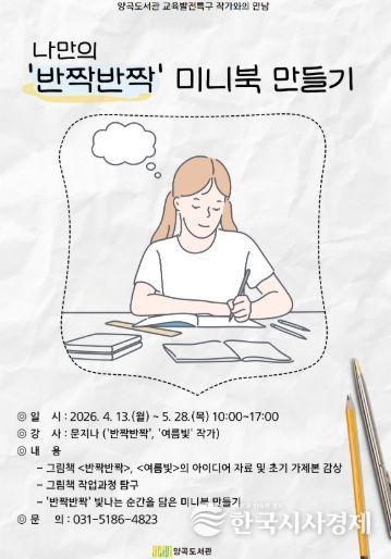 한국시사경제 윤광희 기자 | 김포시 양곡도서관은 2026년 교육발전특구 사업의 일환으로 4월 13일부터 5월 28일까지 관내 초등학생을 위한 스트레스 관리 프로그램 '나만의 ‘반짝반짝’ 미니북 만들기'를 운영한다.