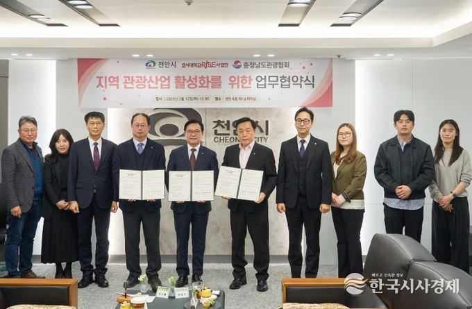 천안시는 12일 시청 제1소회의실에서 호서대학교 RISE사업단, 충남관광협회와 ‘지역 관광산업 활성화를 위한 업무협약’을 체결했다.