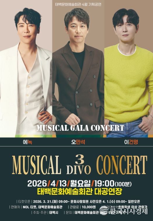 태백문화예술회관 관계자는 “대한민국을 대표하는 뮤지컬 배우들이 한 무대에서 펼치는 특별한 갈라 콘서트”라며 “시민들이 뮤지컬의 매력을 가까이에서 느낄 수 있는 뜻깊은 공연이 될 것으로 기대한다”고 말했다.