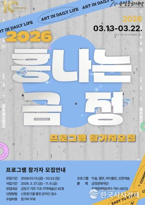 한국시사경제 부산취재본부 | (재)금정문화재단은 2026 금정 기초 문화예술교육 지원사업 '흥나는 금정' 프로그램의 참여 지역 예술가를 오는 3월 13일부터 3월 22일까지 모집한다고 밝혔다.