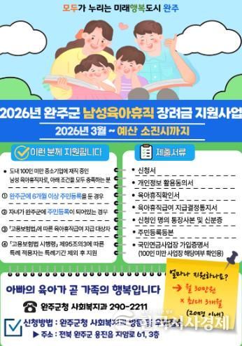 13일 완주군은 남성 근로자의 육아휴직 사용을 독려하고 자녀 양육에 따른 경제적 부담을 덜어주고자 ‘2026년 남성 육아휴직 장려금 지원사업’을 본격적으로 추진한다고 밝혔다.