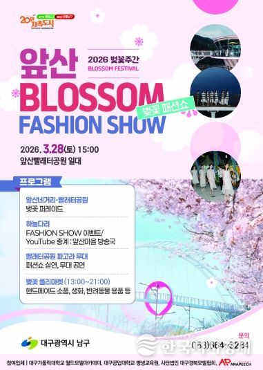 이번 행사는 벚꽃 개화시기에 맞춰 오는 28일 앞산빨래터공원 특설 무대와 앞산해넘이전망대, 하늘다리에서 전문 모델과 시민들이 참여하는 패션쇼 이벤트와 다양한 플리마켓이 운영된다.