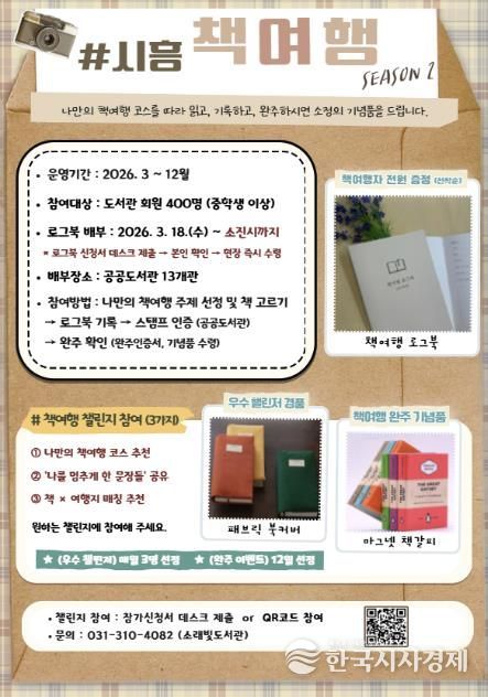 한국시사경제 경기취재본부 | 시흥시도서관은 시민의 독서 실천을 지원하고 일상 속 독서문화를 확산하기 위해 3월 18일부터 ‘2026 시흥 책여행(시즌2)’ 로그북을 배부하고, ‘책여행 로그북 챌린지’를 함께 운영한다.