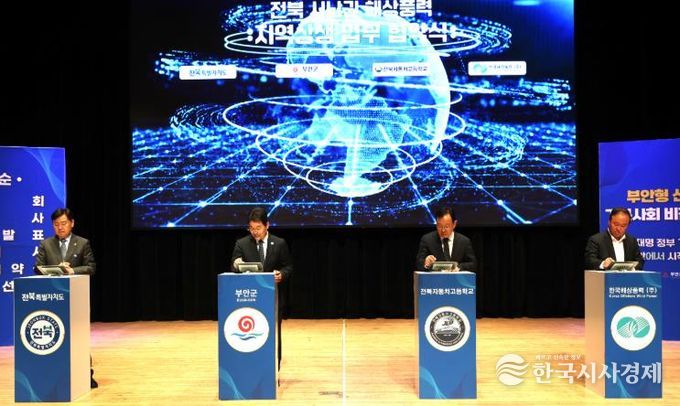 한국시사경제 김숙영 기자 | 부안군은 18일 부안예술회관에서 열린 부안형 신바람 기본사회 비전 선포식에서 전북특별자치도, 전북자동차고등학교, 한국해상풍력(주)와 함께 전북 서남권 해상풍력 지역 상생 업무협약을 체결했다고 밝혔다.