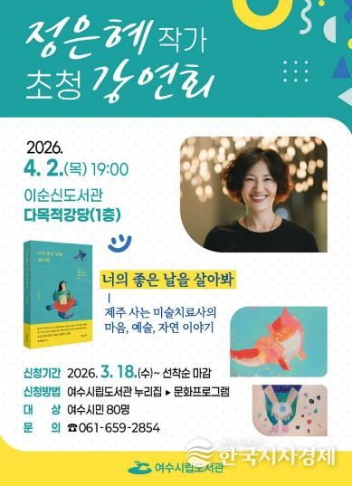 한국시사경제 전남취재본부 | 여수시는 오는 4월 2일 오후 7시 이순신도서관 다목적강당에서 정은혜 작가를 초청해 강연회를 개최한다고 밝혔다.
