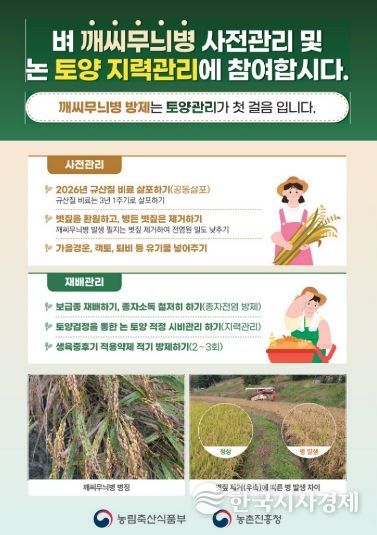 특히 지난해 등숙기 동안 피해가 컸던 깨씨무늬병 예방을 위해서는 종자와 토양 관리를 철저히 해야 한다. 종자는 소금물가리기를 통해 충실한 볍씨를 선별하고, 소독은 약 30℃ 물에서 24~28시간 약제 소독하거나 60℃ 물에서 10분간 처리하는 온탕 소독 방법이 권장된다.