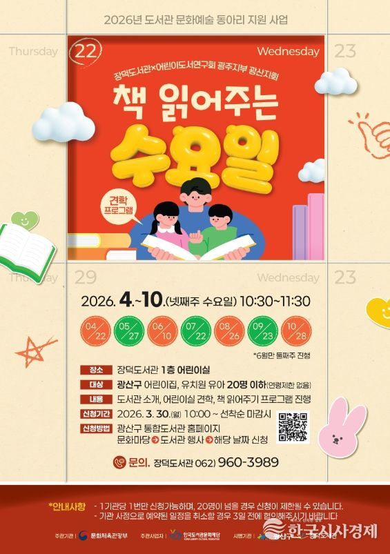 책 읽어주는 수요일은 오는 30일 오전 10시부터 참여기관을 모집하며 광산구 통합도서관 누리집을 통해 선착순으로 진행한다. 일정과 자세한 사항은 누리집 공지사항에서 확인하면 된다.