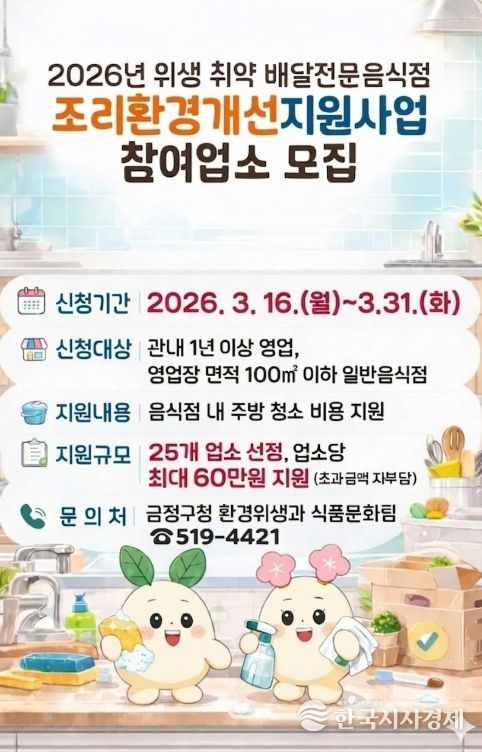 한국시사경제 부산취재본부 | 부산 금정구는 배달앱 사용 보편화 및 외식문화 트렌드 변화로 급증하고 있는 소규모 배달음식점을 대상으로 영업장 청소 비용을 지원하는 "조리환경개선 지원사업”을 실시한다고 밝혔다.