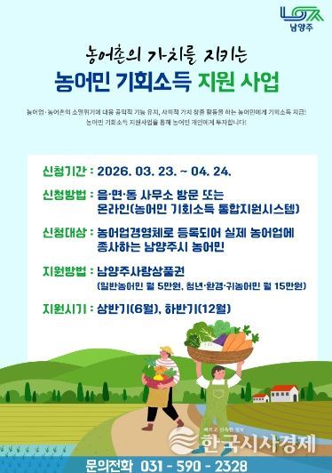 한국시사경제 경기북부취재본부 | 남양주시는 오는 23일부터 ‘2026년 농어민 기회소득 지원사업’을 신청받는다고 18일 밝혔다.