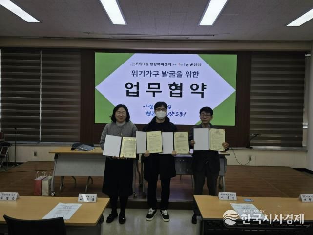 한국시사경제 문화팀 | 아산시 온양3동 행정복지센터는 hy 온양점과 복지 사각지대에 놓인 위기가구를 조기에 발굴하고 맞춤형 복지서비스를 연계하기 위한 업무협약을 체결했다.