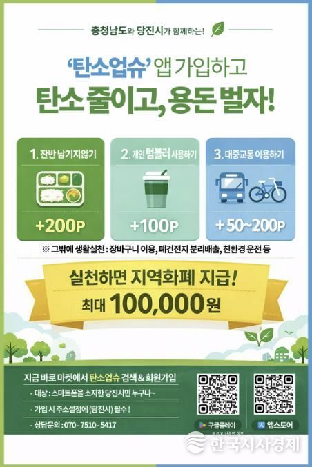 한국시사경제 충남취재본부 | 당진시는 기후위기 대응을 강화하고 시민들의 자발적인 탄소중립 실천을 확산하기 위해 충남형 탄소중립포인트제 ‘탄소업슈’ 가입자 확대를 본격 추진한다고 19일 밝혔다.