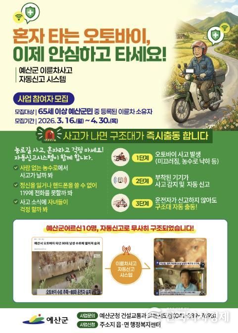 한국시사경제 충남취재본부 | 예산군은 이륜차사고 발생 시 자동 신고를 통해 신속한 구조를 지원하는 ‘이륜차사고 자동신고 시스템 운영’ 사업을 추진한다.